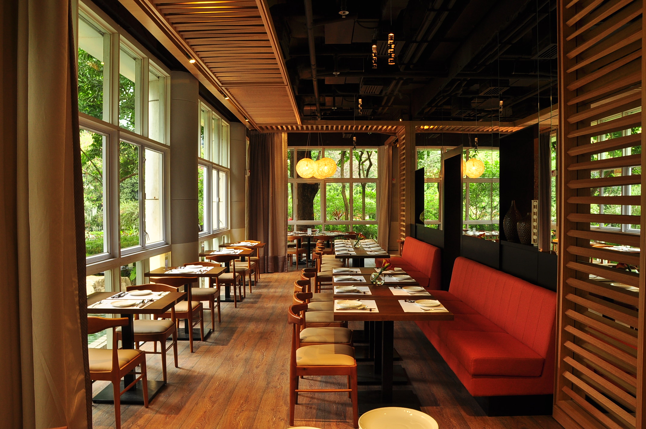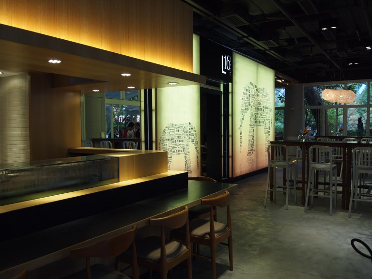 Design project with Hands Creations Limited. L16 café & bar situated inside Hong Kong Park. Beautiful scenery, all you can see are trees and the lake at the back. Being a Thai fusion restaurant, the graphic team use dishes names outline an elephant to create a symbol at the entrance. Playing with mirrors, the reflections of the trees juxtapose into interiors. In the middle of the restaurant is the bar, special made red leaf glass mosaic walls, oak veneer attic roof and modern chandelier bring different quality to the restaurant.