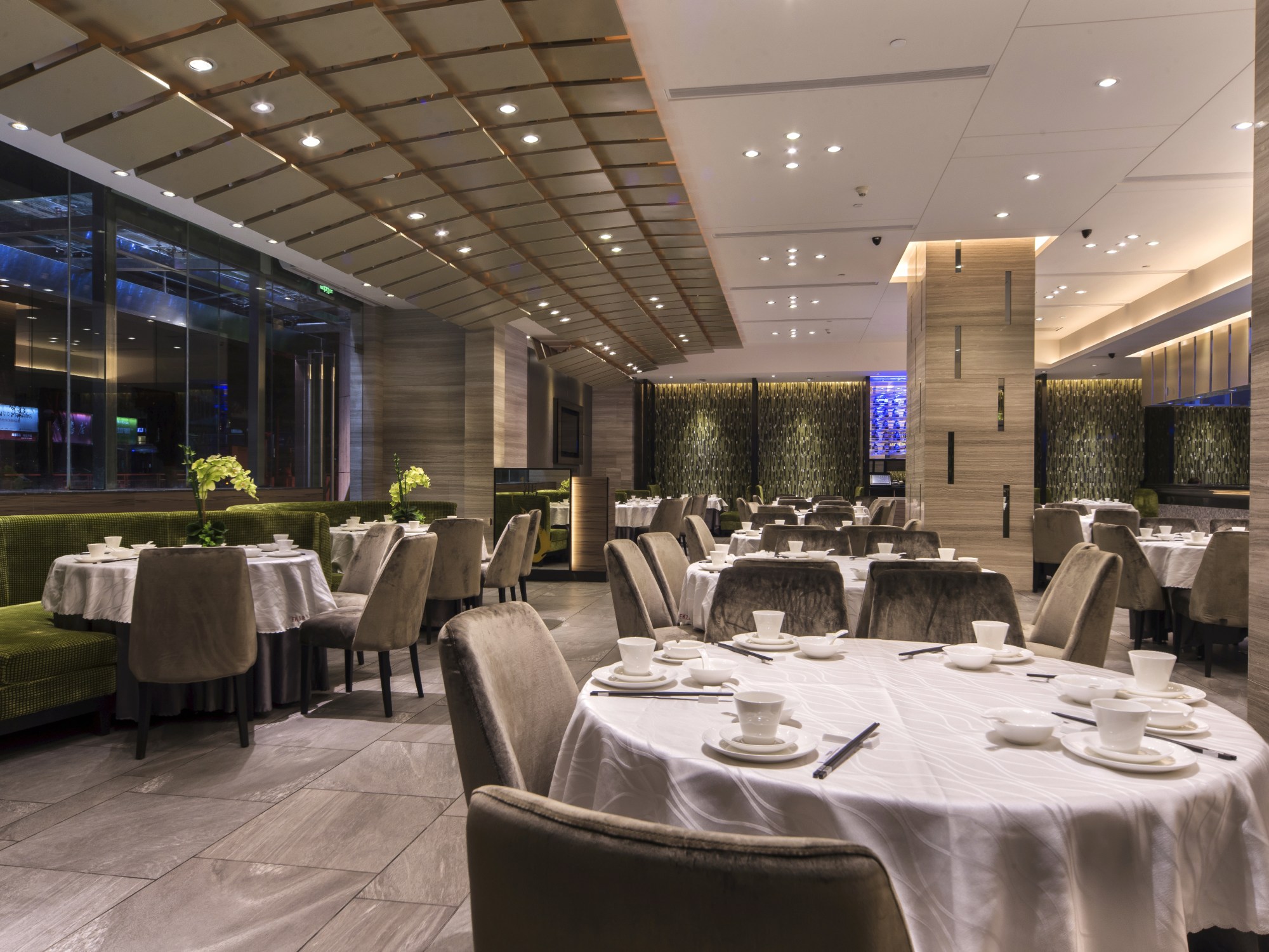 Yes, as you can see, there is no pendant light in the restaurant. Instead of using decorative lights, I design something more architectural. The ceiling near the entrance was composed by 165 nos. of metal plates with LED lights behind. They stacked up and create a soft curve ceiling. The orange colour LED light contrast with the green surrounding and turn the whole place warmer. It just likes sunshine. That is a beautiful accident. The contractor cannot give us off white colour LED lights, then I have to choose from yellow or orange colour.
