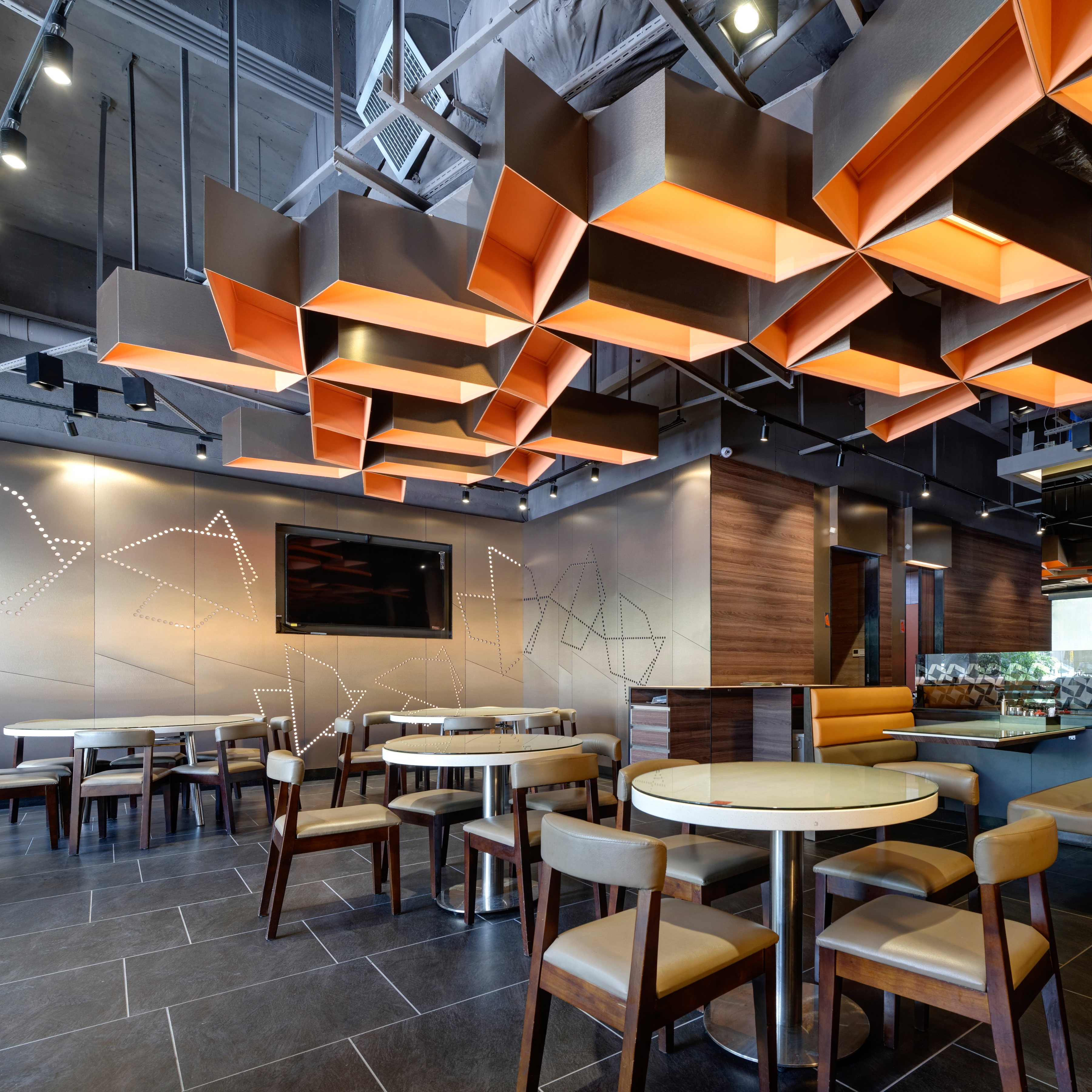 Over the years Hung Wan restaurant has established quite a reputation for itself, and now the restaurant is expanding and bringing with it a new look in hopes of attracting customers from a younger demographic. The restaurant’s interior has been revamped with a vibrant, energetic design that gives the restaurant a younger, fresher look. Grey laminated glass used to divide booths are a sleek and modern touch, and perforated bronze backdrops inspired by the restaurant’s logo are used to decorate the walls. The look is tied together by pinwheel pendant lamps that give the interior a warm orange hue. Renovations aren’t just limited to a new look — the newly redesigned kitchen and BOH area also increase efficiency and allow staff to serve the restaurant’s growing customer base quicker and easier than ever before.