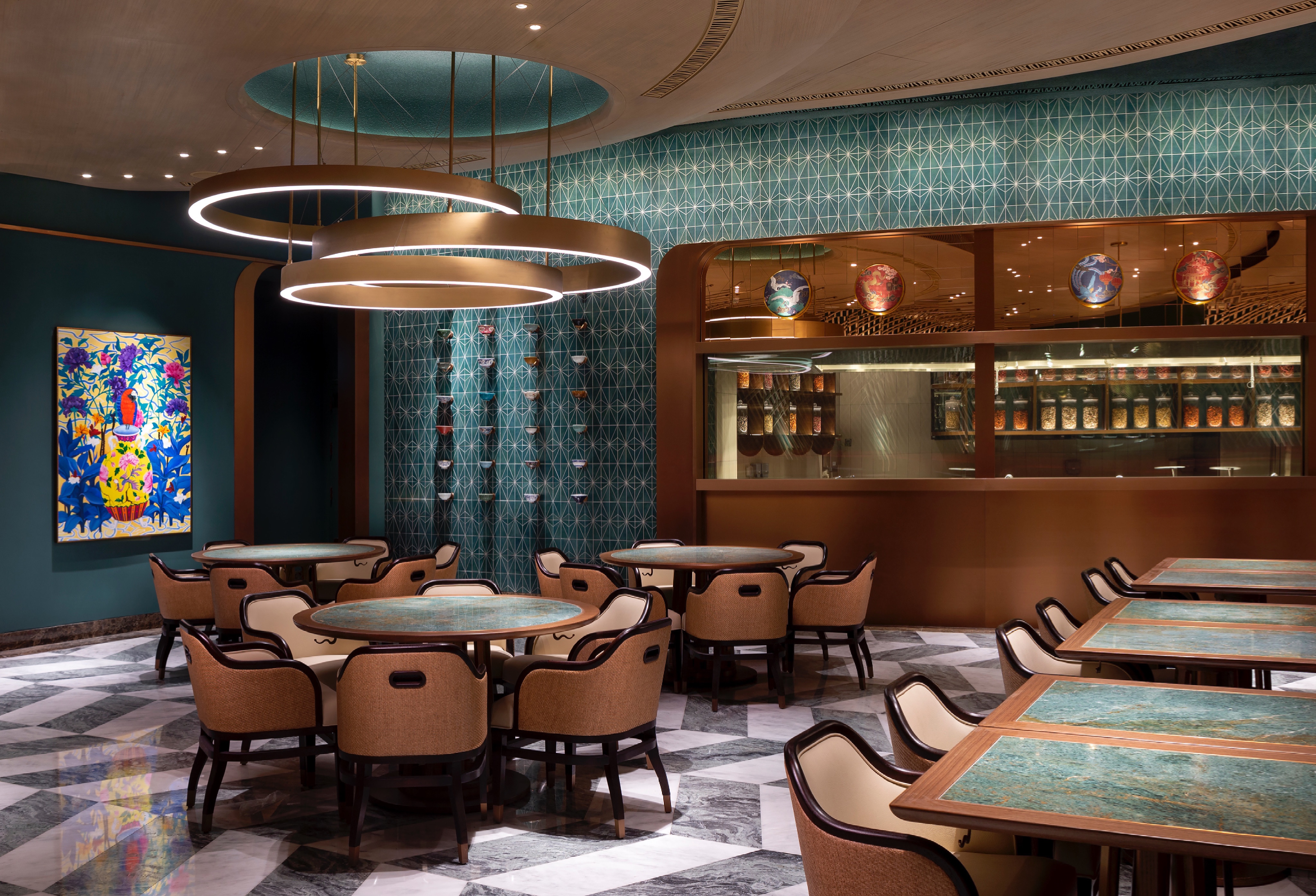 Curved elements are carried throughout, in expressing this contemporary Chinese restaurant with a sophisticated touch. Fan shaped decorative lights suspended from ceiling are conceived as golden coins flipped through the air. Incorporated as a striking design accent, they also cite the essence of luck and fortune emanating from the casino.